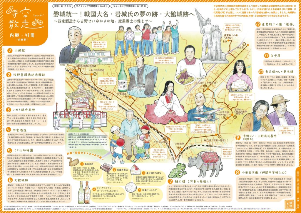 平安時代末に陸奥国岩城郡の豪族として発祥した岩城氏は鎌倉時代以降には岩城・白土・好嶋などに分裂して対立します。しかし15世紀頃に白土系岩城氏(10代親隆・11代常隆の頃)が台頭し、ついに宿願であった「磐城地方統一」を果たしました。内郷駅から高坂を経て久保姫ゆかりの大館城、好間・小田炭鉱ゆかりの地などを巡ります。