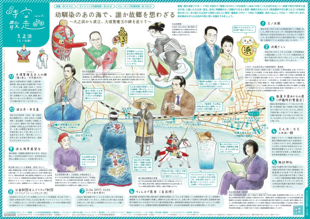 あの歌聖・西行法師(1118~1190)が訪れて「陸奥(みちのく)の古奴見(こぬみ)の浜に一夜寝て明日や拝まむ波立の寺」と謳ったのが久之浜・波立です。近代になって常磐線の久之浜駅ができると西行ゆかりの古奴見(久之浜の古名)の浜に憧れた東京・関東の文化人たち(幸田露伴や竹久夢二など)が当地を訪れました。また逆に久之浜から東京に出た人に歌手・霧島昇や漫画家・武内つなよしがいます。海を眺めながら、久之浜の今昔に想いを馳せてみましょう。
