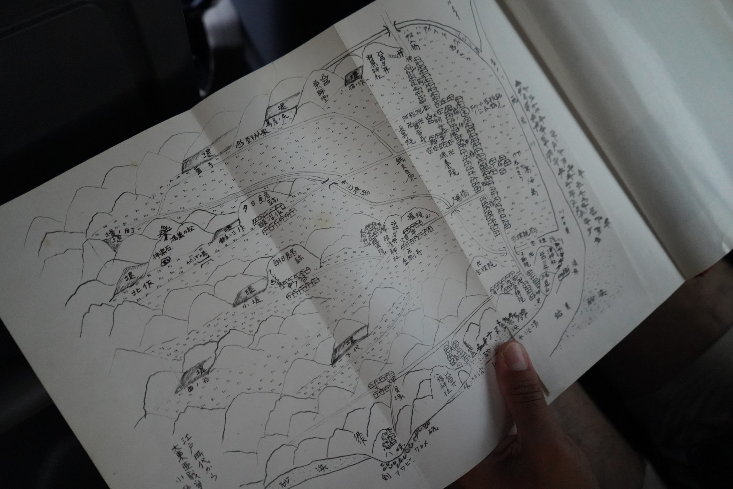 下川地区を中心に三戸さんの思い出話を聞きながら車で巡りました。三戸さんの案内のもと『下川郷土史』に載っていた古地図と照らし合わせながら道を辿ると、城下町の名残でクランク道が今も残っていました。