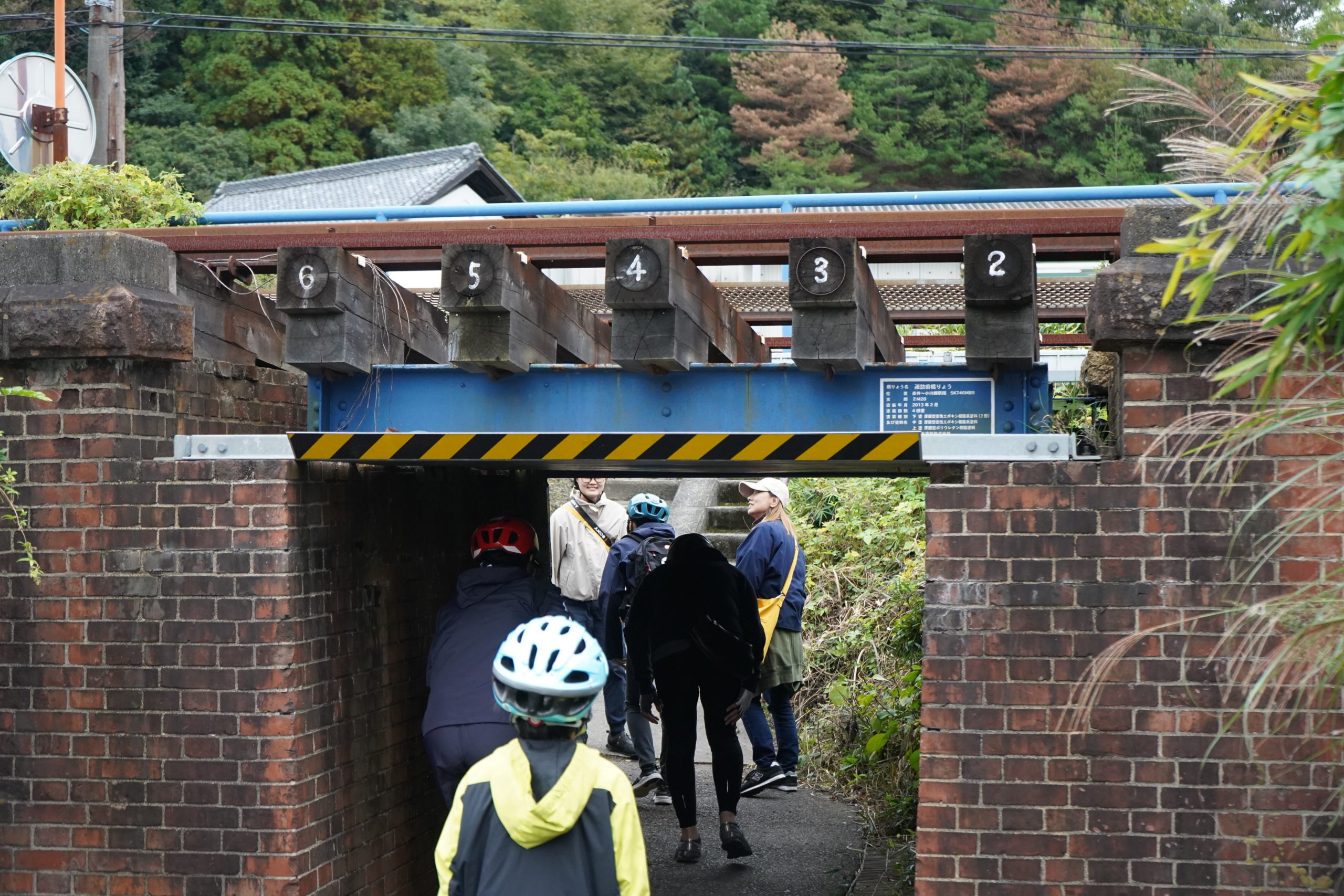 そして、神社から少し歩くと、昔ながらのレンガ造りの鉄道橋がありました。上には木の枕木が並び、2~6の数字が書いてありました。線路のすぐ下を通れることに子供たちはおおはしゃぎ。大人が通ると、少ししゃがまないと頭が当たってしまうくらいの小さな通路で、ワクワクするスポットの発見でした。
