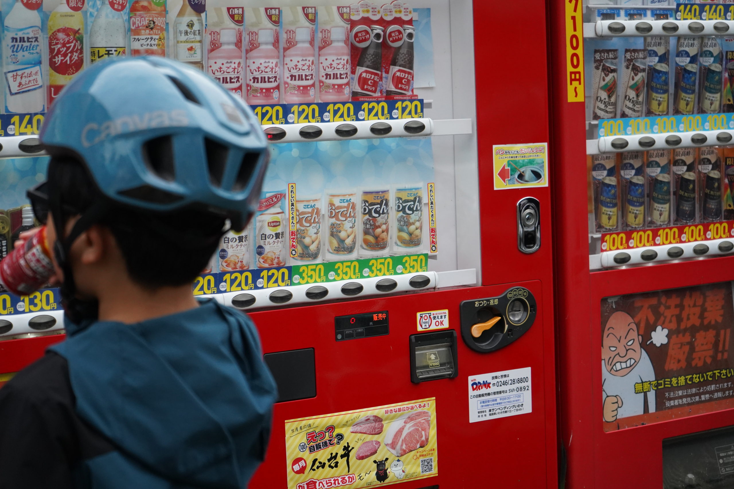 高木さんの話を聞いていると、どんどん比良団地周辺の炭鉱時代の光景が浮かび上がってきて、とても面白かったです。そして、比良団地の前にある自販機で、少し休憩タイム。この日は、肌寒くなってきた頃でしたが、自販機には『冷やしおでん』が・・・みなさん温かい飲み物を買っていました。この自販機の場所も、元々はクリーニング屋兼駄菓子屋だったそうで、子供たちの憩いの場だったんだとか。「ストリートファイター2とかやったな~アーケードゲームが初めて赤井に来たんですよ!」と当時の懐かしい思い出話でも盛り上がりました。