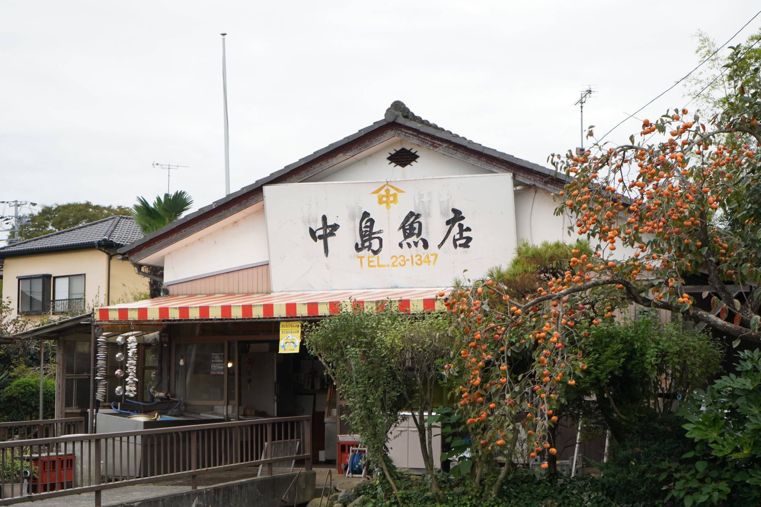 休憩後、また自転車で走っていきます。次に止まったのは、『中島魚店』です。高木さんが見つけた地図にも今と同じ場所に『中島商店』と描かれています。参加者の小学生の子も、スイミングスクールのバスでこの道を通り、気になっていたそうです。すると、お店の中からお母さんが犬を抱っこしながら出てきてくれました。