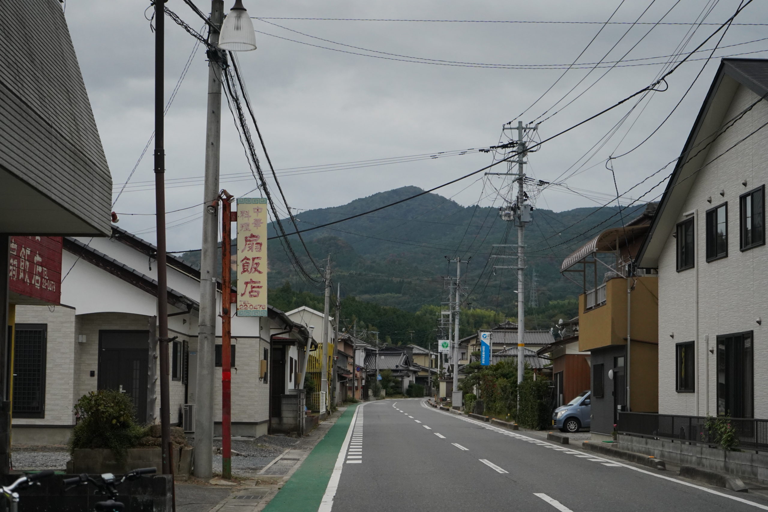 雰囲気のある中華屋の看板があったのですが、残念ながら閉店している様子でした。サポーターの鈴木さんは、閼伽井嶽薬師にお参りした後はここで食べて帰るのがルーティンだったそうです。たしかに閼伽井嶽からまっすぐこの道につながっています。聳え立つ閼伽井嶽を横目に、田んぼ道を走っていきます。