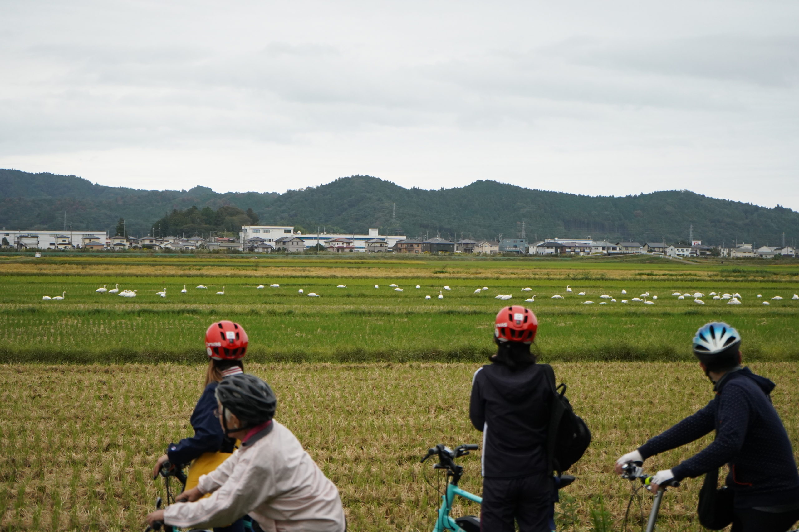 再び田んぼ道を走っていくと、田んぼの中に、何か白色の物体が見えるな・・・と思ったら、なんと白鳥の大群でした!毎年、夏井川に来ているところはよく見ますが、赤井の田んぼにも来ているようで、『白鳥飛来の郷の米・ライスワン』と書かれた看板もすぐ近くに見つけました。白鳥が落穂や生き物をついばんでいる田んぼで栽培された安全なお米とのことです。みんなで白鳥を遠くからそっと見守りました。