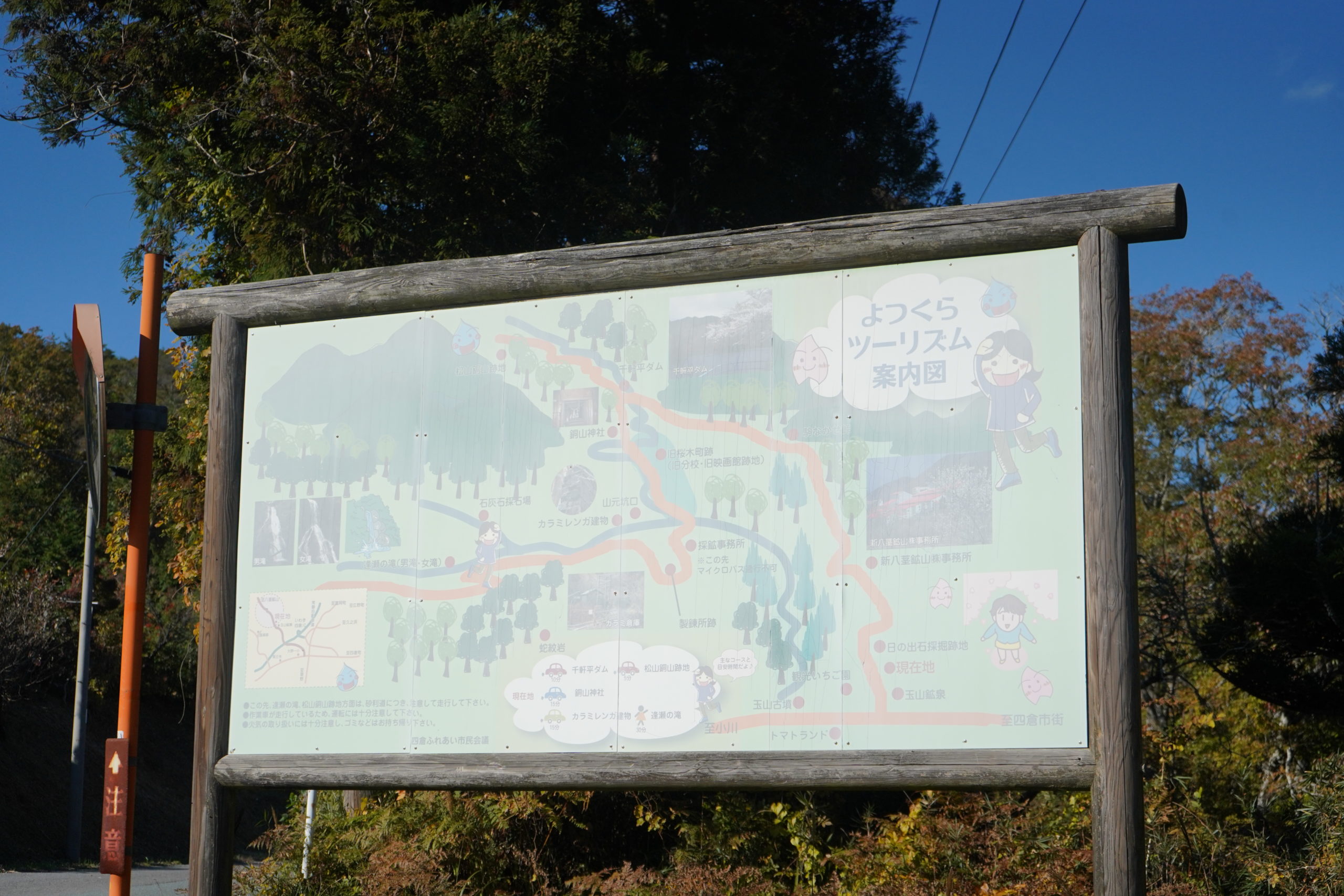 まず向かった先は、藤屋旅館から少しのぼったところにある『よつくらツーリズム案内図』と書かれたもう色褪せてしまっている看板。しかし、よく見ると玉山周辺のスポットが細かく載っています。「千軒平ダム」「カラミレンガ建物」「製錬所跡」「新八茎鉱山㈱」「銅山神社」など、このエリアの産業やまちの移り変わりが読み取れます。
