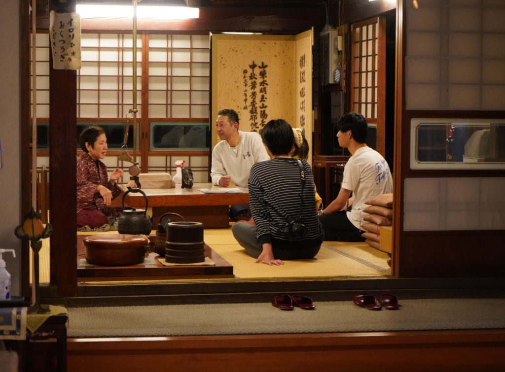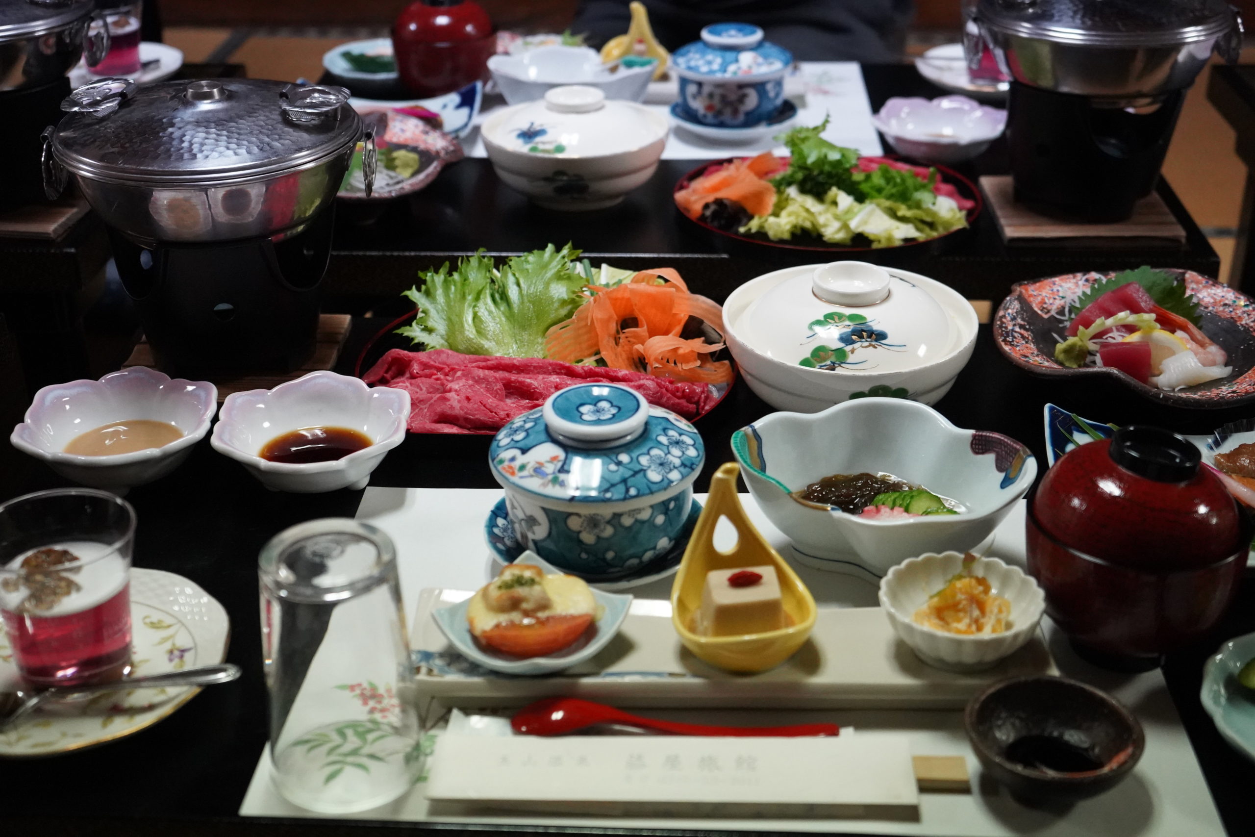 そして、時空散走サポーター、スタッフたちは、そのまま藤屋旅館に宿泊させていただきました!ツアーの振り返りやお喋りを楽しみながら、お肉に魚、季節の一品たちがたくさん詰まった豪華な夕食をいただきました。料理がすべて美味しく、ツアー後の私たちの身体に沁みました。翌朝も、朝風呂に入り、朝食へ。美味しいご飯のお供がたくさんあって、みんなおかわりしてしまうほどでした。こんなツアーの楽しみ方もありですね。