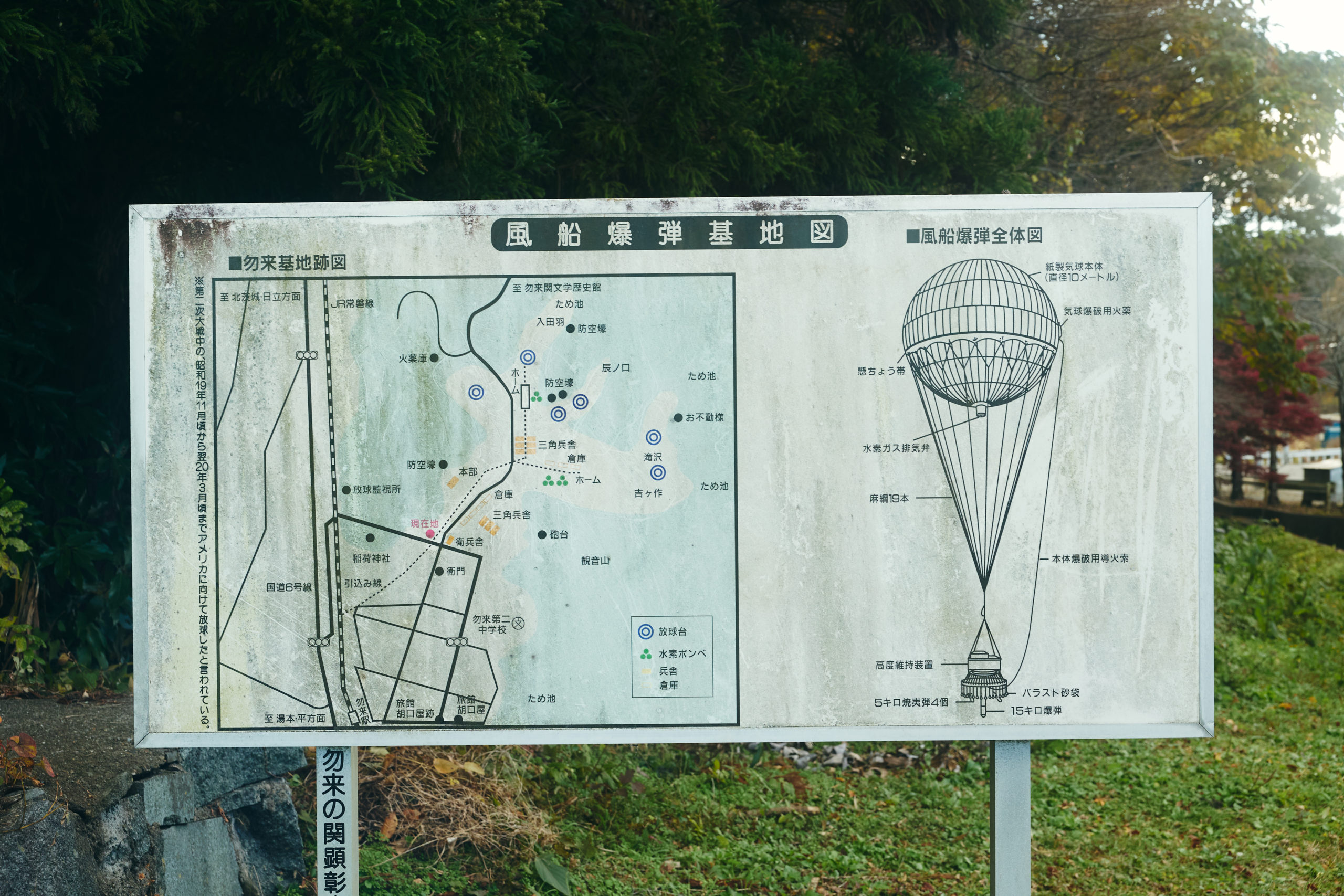 さて、義家に見守られながら、勿来駅を出発!駅の裏側へ走っていきますよ~!最初のスポットは、『風船爆弾案内図』です。太平洋戦争末期、日本軍は直径10メートルの気球に爆弾を搭載し、上空1万メートルの偏西風に乗ってアメリカを空爆する秘密兵器「風船爆弾」を開発しました。植田高等女学校(磐城農業高校)の女学生たちが呉羽化学工業錦工場(現・クレハいわき事業所)で気球製造に携わったといいます。和紙をこんにゃく糊で張り合わせて気球を作ったそうで、その作業を当時女学生たちがやっていたとは驚きでした。